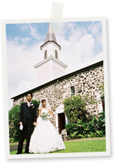 二人が式を挙げたのは、1820年に建てられたハワイ諸島では最も古い歴史をもつ由緒ある教会でした。ハワイ産の天然素材(溶岩や珊瑚礁など)で造られていています。歴史の重みを感じる荘厳で素晴らしい教会でした。